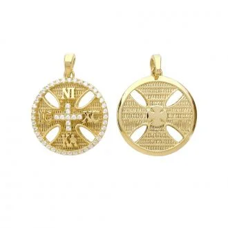 Χρυσό φυλακτό με το Χριστόγραμμα, διπλής όψης με σταυρό στην άλλη πλευρά. Λεπτομέρειες με πετράδια ζιργκόν στο Χριστόγραμμα