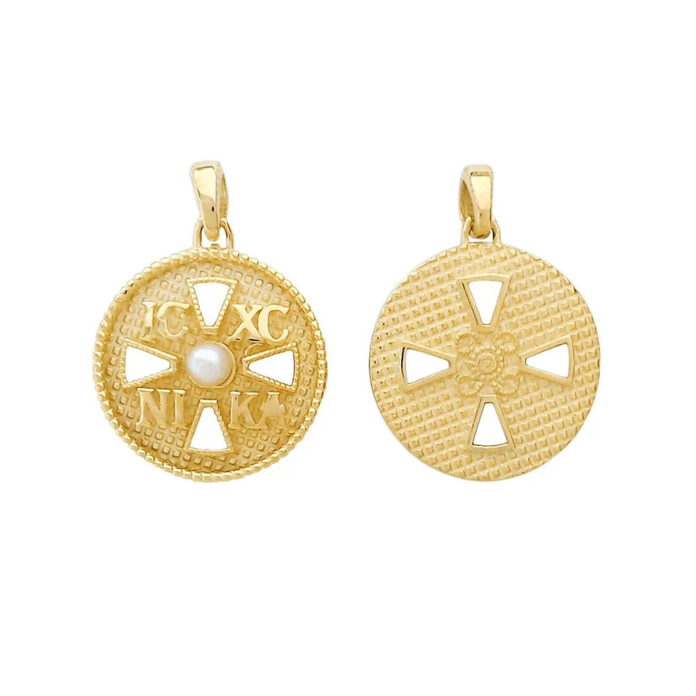 Χρυσό στρογγυλό φυλακτό κωνσταντινάτο, διπλής όψης με μαργαριτάρι απο τη μία και το Χριστόγραμμα από την άλλη.