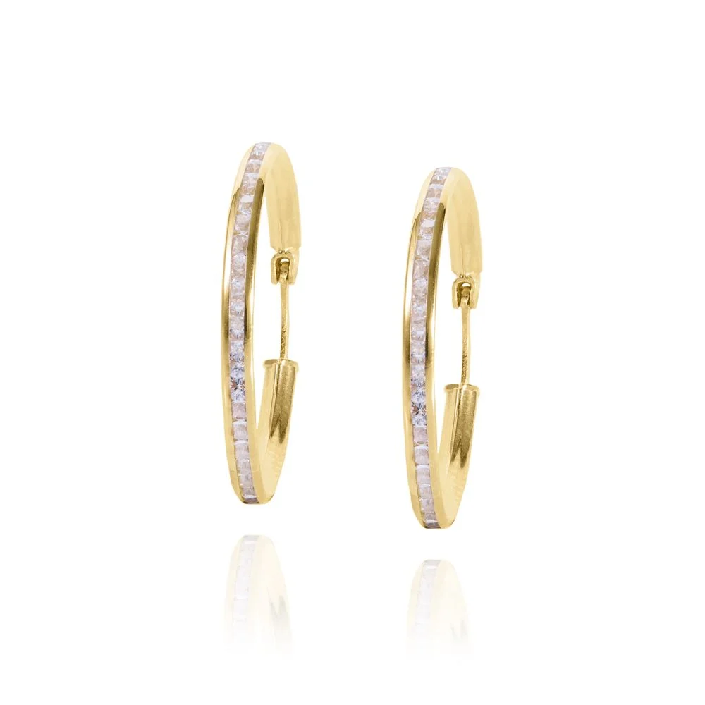Χρυσοί κρίκοι με λευκές πέτρες περιμετρικά. Εξωτερική διάμετρος 1,9 εκ.