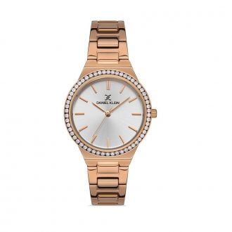Γυναικείο ρολόι Daniel Klein με ροζ καντράν και ατσάλινο μπρασελέ. Λεπτομέρειες με πετράδια ζιργκόν στο καντράν.