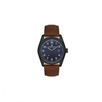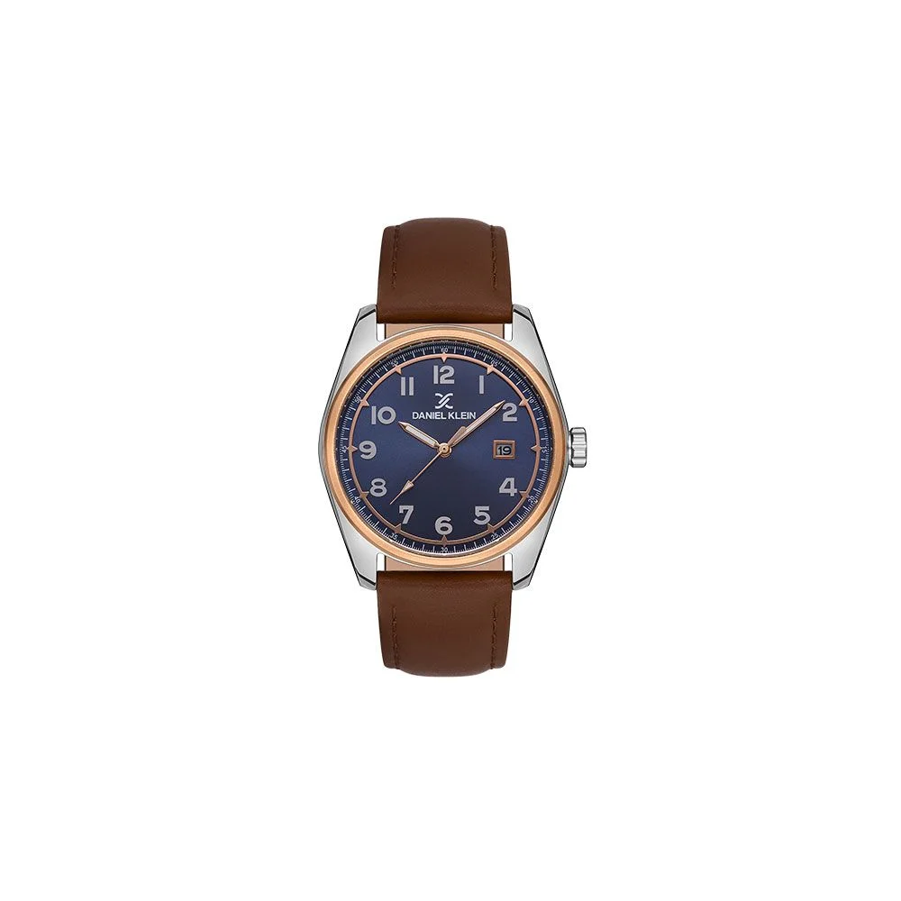 Ανδρικό ρολόι Daniel Klein με καφέ δερμάτινο λουρί, μπλέ καντράν και ασημένια κάσα. Ένδειξη ημερομηνίας