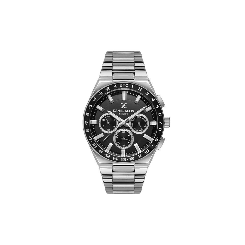 Ανδρικό ρολόι Daniel Klein με ατσάλινο μπρασελέ και μαύρο καντράν. Ένδειξη ημερομηνίας, ημέρας και 24ωρο.