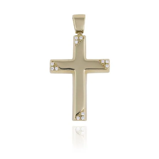 Γυναικείος χρυσός Σταυρός διπλής όψης. Λεπτομέρειες με πετράδια ζιργκόν στη μια πλευρά.