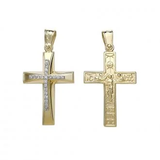Γυναικείος χρυσός σταυρός διπλής όψης, με λευκές πέτρες στη μία όψη και τη βάπτιση στην άλλη.