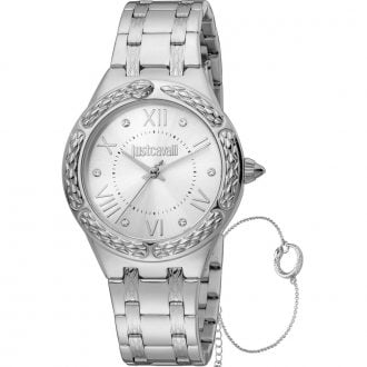 Γυναικείο ρολόι Just Cavalli σε χρυσό χρώμα, με ασημί καντράν και ατσάλινο χρυσό μπρασελέ. Λεπτομέρειες με πέτρες στο καντράν.