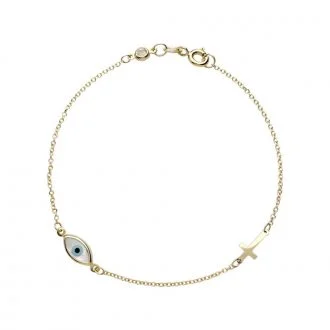 Λευκόχρυσο βραχιόλι με ματάκι και σταυρό με λουστρέ επιφάνειες και λευκή πέτρα ζιργκόν στο κούμπωμα