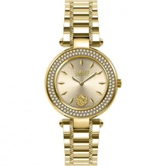 Γυναικείο ρολόι Versus Versace με μαύρο καντράν και ατσάλινο μπρασελέ. Λεπτομέρειες με πέτρες ζιργκόν στην κάσα.