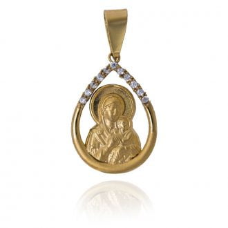 Χρυσό φυλακτό με την εικόνα της Παναγίας σε λευκόχρυσο. Λεπτομέρειες με πετράδια ζιργκόν.