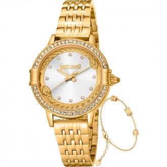 Γυναικείο ρολόι Just Cavalli σε ασημί χρώμα, με ασημί καντράν και ατσάλινο μπρασελέ. Λεπτομέρειες με πέτρες στο καντράν.