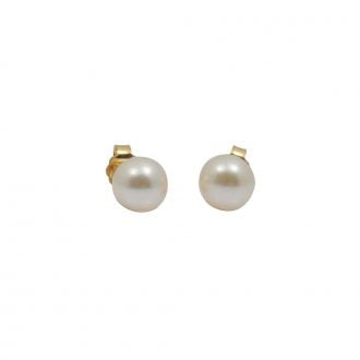 Λευκόχρυσα σκουλαρίκια με μικρό μαργαριτάρι πλακέ. Διάμετρος 6,5mm.